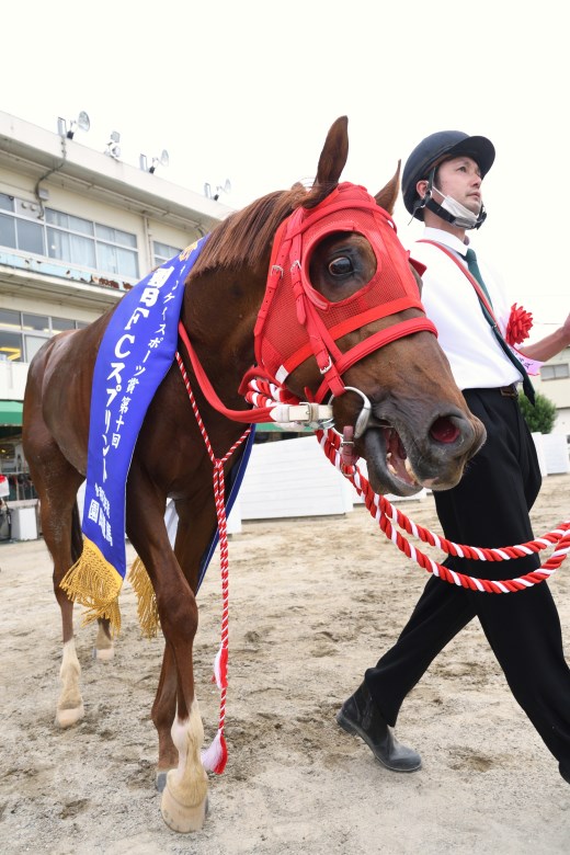 エイシンエンジョイは昨春、兵庫に移籍し、これが重賞4勝目。豊富なスピードと直線での粘りを生かし、1400メートル以下で強さを見せる。ゴール後に「馬を止める力がなくなるくらい追いました」(下原騎手)と、そのまま馬場を1周してゴール方向から帰ってきた。その際、「ビジョンに僕が映っていたので、勝ったかなと思いました」とのこと。人馬とも全力で駆け抜けた820メートルだった。