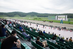 それでも幸いなことに、雨雲は20分程度で過ぎ去った。代わりにやってきたのは初夏の太陽。パドックの路面はあっという間に乾き、第1戦に出走する数頭の体には汗が浮かび上がっていた。