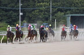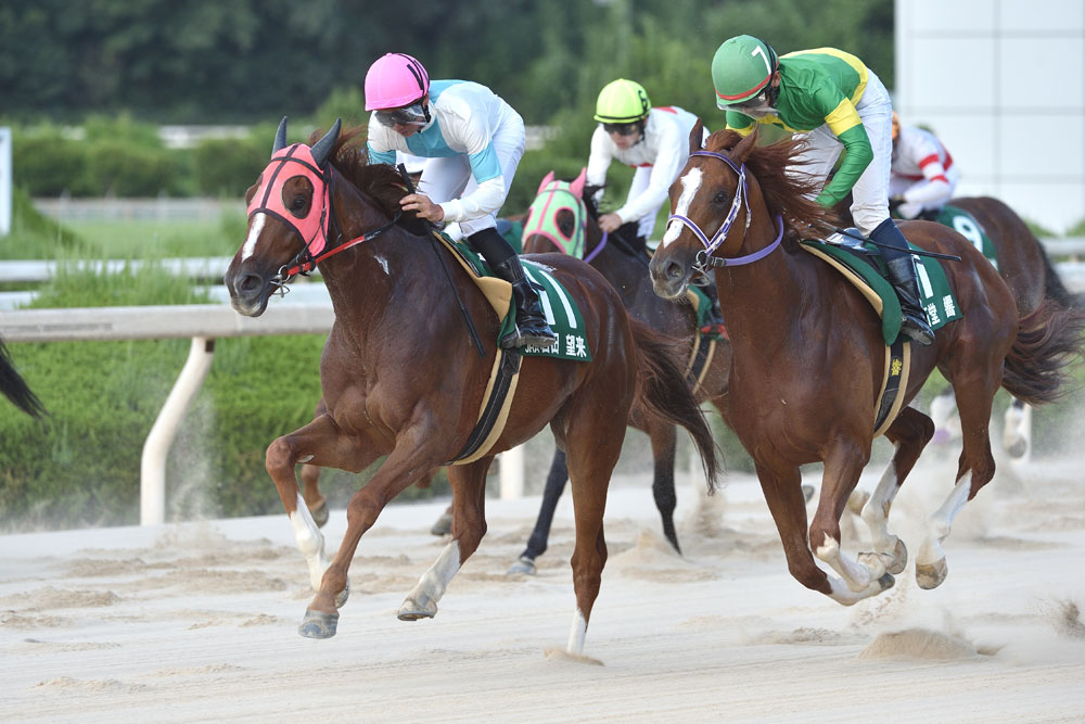 第2戦も同じく1400メートルだが、近4走で逃げた馬が1頭もいないというメンバー構成。スタートから促し気味に行ったのは先月のCBC賞GⅢで重賞初制覇を遂げた齋藤新騎手(JRA)。そこへ好スタートを決めた多田羅誠也騎手(高知)が並びかけ、2頭並んだハナ争いは1コーナーを回って多田羅騎手が前に出た。その2頭を見ながら岩田騎手が続き、3コーナーで出水騎手が外から進出。そこに兼子千央騎手(金沢)、石堂騎手が加わって、6頭がほぼ横並びで4コーナーを回った。