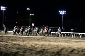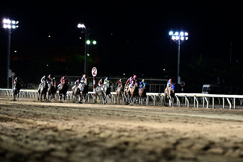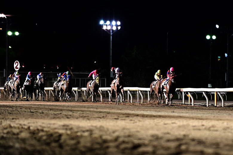 福原杏騎手(浦和)が「船橋の1700メートルは特殊ですから」と話した第1戦の舞台。好スタートを決めて先行したのは小林凌大騎手(JRA)と秋山稔樹騎手(JRA)で、そこに大外枠から池谷騎手が加わった。後続の各騎手も前の位置を取ろうと意識したためか、1コーナーでは多くの馬が横に広がる形になった。