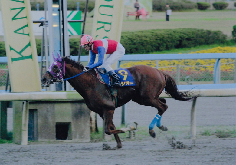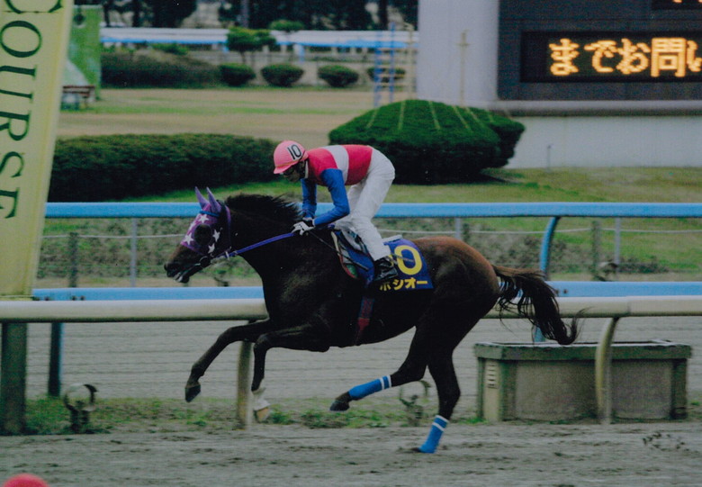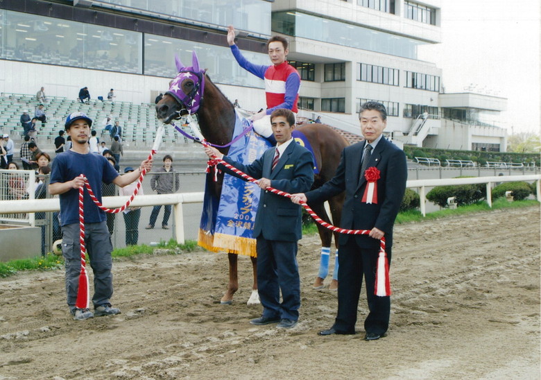 7歳の癖馬が金沢に来たのは2003年の秋。中央では45戦6勝のオープン馬だった。「中央の騎手に聞くと、乗り手に歯向かうし、手に負えない」。レースを見ても、後方待機から直線勝負ばかり。恐る恐る乗っているのが伝わってきた。到着後、実際の姿を見ると左目が白内障で、右前脚に屈腱炎の兆候も見られた。前途多難が予想されたが、松原正文調教師の懸命の立て直しで、移籍初年は重賞の北國王冠、中日杯を含む3戦3勝。元中央オープンの看板は伊達ではなく、中日杯は後続を大差で下し、力の違いで年度代表馬に選出された。ただ、折り合い難は中央時と変わりはなかった。