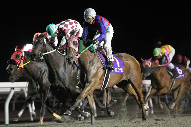 ゲートが開いて、ほぼ一斉のスタートとなったが、1番人気ルージュロワイヤルのダッシュがつかず、最後方に置かれてしまう。逆にダッシュよく飛び出したのがホワイトラヴィーナ、ジュエルクイーンのフルールカップ2、3着馬。2頭が並ぶような形でレースを引っ張り、外枠スタートのミラクルフラワー(父プリサイスエンド)、ドンローズ、レッドムーンらも差がなく追走。3~4コーナーに差し掛かかったところで、外をまわしてルージュロワイヤルもポジションを上げていく。直線に入ると、最内に入れたレッドムーンが先頭に立ち、二の脚を使って粘り込みを図ろうとする。後続各馬も差を詰め、横一戦に数頭が並ぶ白熱した展開に。残り200のハロン棒を過ぎたあたりで馬場のまん中からドンローズ、その外からジュエルクイーンが並んで抜け出し、レッドムーンを交わしてゴールを目指す。この2頭で決まるかと思ったところに、大外から飛んできたのがステファニーラン(父スウェプトオーヴァーボード)。直線に入ったところでは最後方に位置していたが、松井伸也騎手がゴーサインを出すと同時にギアが入り、その左ムチに応えて力強く脚を伸ばす。見る見る間に前との差を詰め、ゴール手前で図ったように全馬を差しきって優勝。まさに“ごぼう抜き”という言葉がピッタリとはまる、目の覚めるような末脚だった。