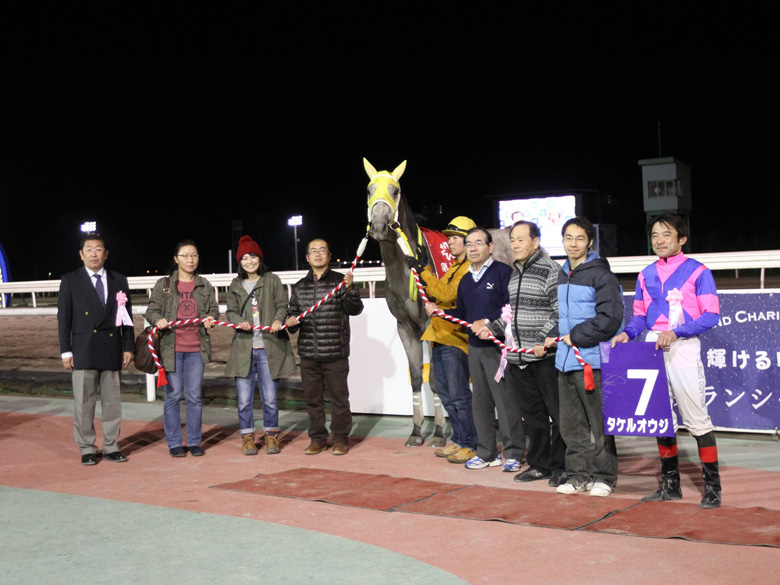 スタンド前のスタート地点に12頭が集まってゲートイン。ほぼ一斉の飛び出しだったが、フジノサムライとクラヴィクトリー(牡、父トワイニング)のダッシュがつかずに後方へ置かれ、最初のコーナーに差し掛かる。1番人気オヤコダカがスピードの違いで先手を取ろうとするところ、コーナーワークを利してグローリーキング(牡、父フサイチコンコルド)がハナを奪った。オヤコダカは無理せず2番手につけ、少し離れた3番手集団に紅一点のフォーティクイン(牝、父フォーティナイナーズサン)、ヘブンズゲート、クラバズーカー、ハニームーン(牡、父メイショウサムソン)らが並んで追走。2番人気タケルオウジはその後ろ、中団の外へ持ち出した。3~4コーナーでタケルオウジが外から徐々にポジションを上げていき、先行していたオヤコダカ、最内にポジションを取ったクラバズーカーらと並んで直線に入る。直線で先に抜け出したのは内のクラバズーカーだったが、馬場の真ん中から一完歩ずつ差を詰めたタケルオウジが残り100mあたりでこれを捕え、そのまま力強く押し切って先頭でゴールイン。2着には4コーナーで一旦置かれたハニームーンが鋭く伸びて1馬身半差まで詰め寄り、3着にはクラバズーカーがなんとか粘り込むという結果に。オヤコダカは4コーナーですでに手応えが怪しくなり、直線ではまったく伸びずに11着と大敗した。
