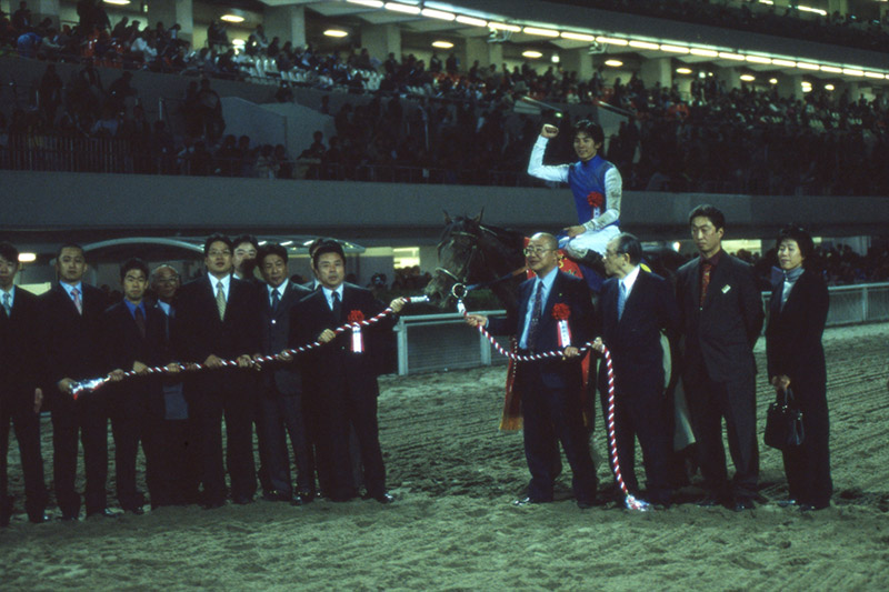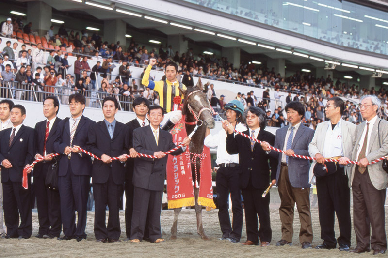 そして園田競馬場ではめずらしいウイニングラン。松岡騎手はよほど嬉しかったのであろう、検量室前に戻ってくると、今度は馬上で両手を大きく広げ「やったー!」と歓喜の声を上げた。
