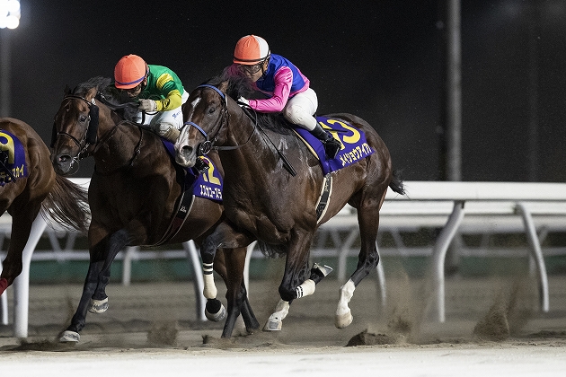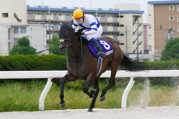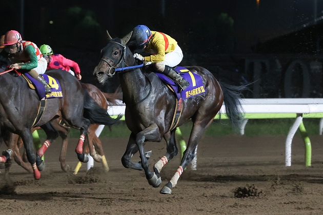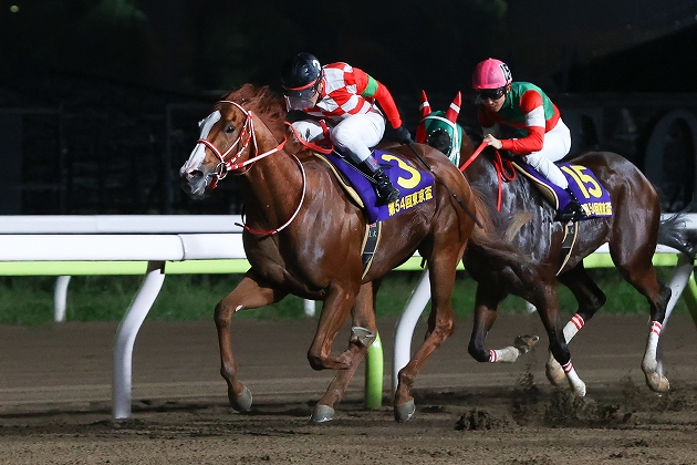 昨年秋にダートの短距離に路線変更すると、それまでとは違った走りでオープンまで駆け上がった。4月の東京スプリントでダートグレードに初参戦し、初めての地方の馬場で鮮やかな逃走劇。最後はサブノジュニアの猛追を振り切った。オープン特別を勝ったばかりの新星とのコンビで優勝したのはともに大井育ちの矢作芳人調教師と坂井瑠星騎手。「一歩目で躓いたにもかかわらずそこからの脚が速くラクに前へ行くことができた。昨年12月頃から馬がグンと良くなっています」と坂井騎手がコメント。その後、小回り1400mのさきたま杯に臨んだが結果5着で、やはりベストはワンターンの1200mか。前走の東京盃では3番手に控える競馬で快勝できた収穫は大きく、一躍有力候補に。