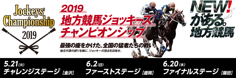 本年から各ステージ名称を、「チャレンジステージ」「ファーストステージ」「ファイナルステージ」と一新し、優勝者は8月24日(土)、25日(日)にJRA札幌競馬場で実施される『2019ワールドオールスタージョッキーズ』(国際騎手招待)の地方競馬代表候補騎手に選定されます。(準優勝者は地方競馬代表補欠候補騎手)