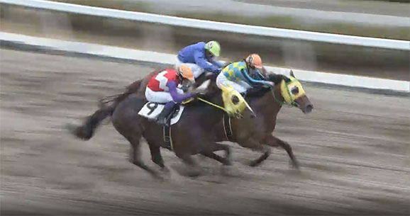 競り合いは内外ピッタリ馬体が接していて、ムチすら打てなさそうなほど。