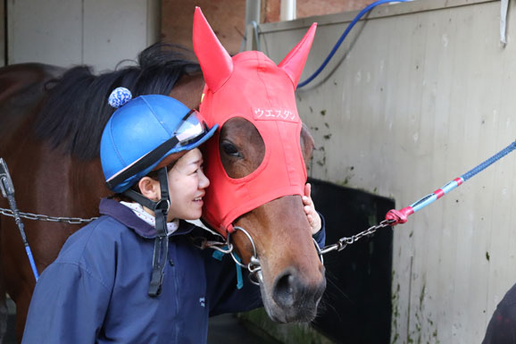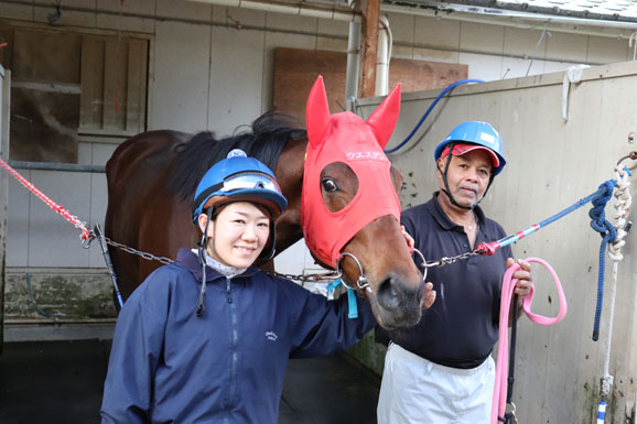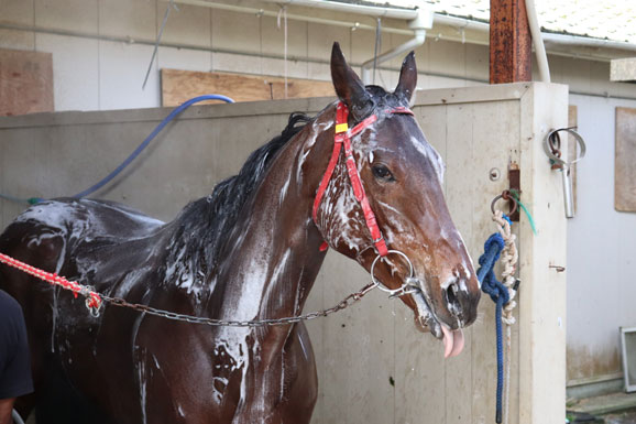 朝7時半すぎ、調教を終えて厩舎の洗い場に帰ってきたばかりでも、馬も人もハッピーオーラが漂っていました。