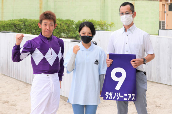 さらに、下原騎手にとってメインステーブルである新子雅司厩舎から初めてデビューする新人騎手が佐々木騎手とあって、昨年7月の名港盃(名古屋)をタガノジーニアスで勝った時には3人で記念撮影するなど厩舎実習の頃から気にかけていました。