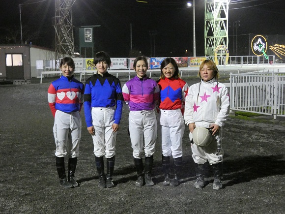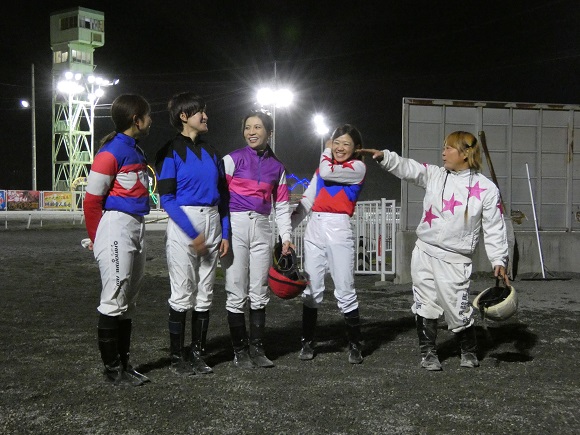 (写真左から)木之前葵騎手(名古屋)、下村瑠衣騎手(高知、引退)、宮下瞳騎手(名古屋)、別府騎手、竹ケ原騎手が帯広競馬場に集結したのでした。