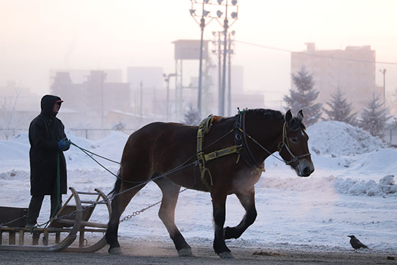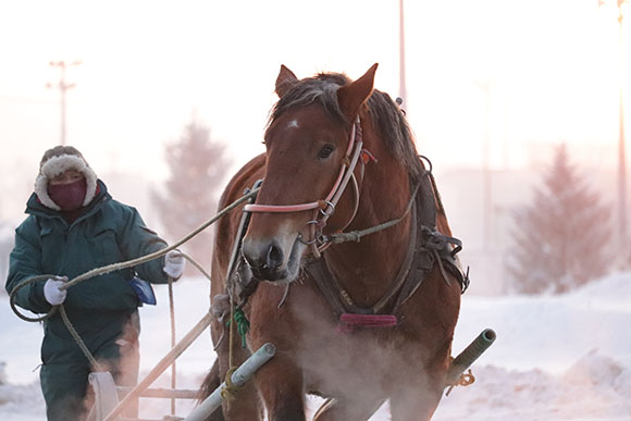 ばん馬のたてがみやまつ毛には霜がつき、人馬ともに吐く息は真っ白。