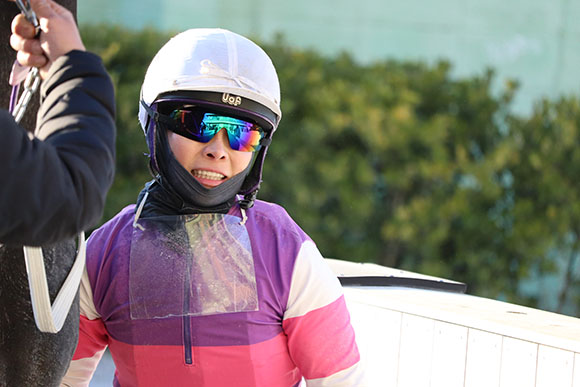 そんな中、カッコイイ形のゴーグルだ!と目を引いたのは宮下瞳騎手(名古屋)のこちら。
