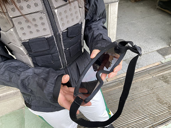 間近で見せてもらうと、従来型のゴーグルと違い、縁にスポンジがあしらわれています。