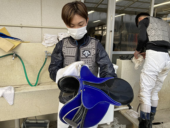 レース直後に鞍の手入れをしながら関本玲花騎手(岩手)が