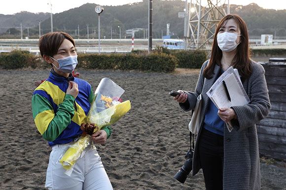 ▲全日本新人王争覇戦のレース後、関本騎手への取材風景。