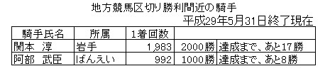 5月31日(水)終了時点で、区切り勝利が近い騎手は、以下のとおりです。