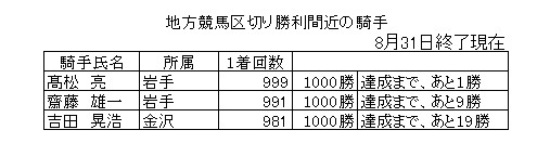 8月31日(木)終了時点で、区切り勝利が近い騎手は、以下のとおりです。