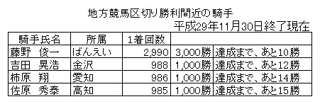 11月30日(木)終了時点で、区切り勝利が近い騎手は、以下のとおりです。