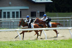 僕たち98期は、8月17日に2回目の発走から追い込みの訓練を行いました。これまでは1頭での走行(単走)でしたが、今回は初めて*1)二騎併走で行いました。