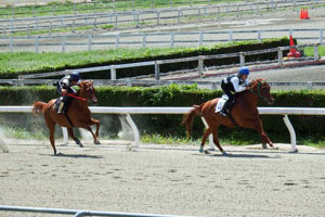 前回の課題であったゲート内での準備は、今回はスムースに行うことが出来ました。初めて2頭で行いましたが、内枠の馬との間隔がつかめず、外に膨らんでしまいました。直線では、手綱のつめかえが遅れてしまい、追い込みが直線半ばからになってしまいました。次回は、併走馬から離れずに走行し、直線に入ったらすぐに追えるようにします。
