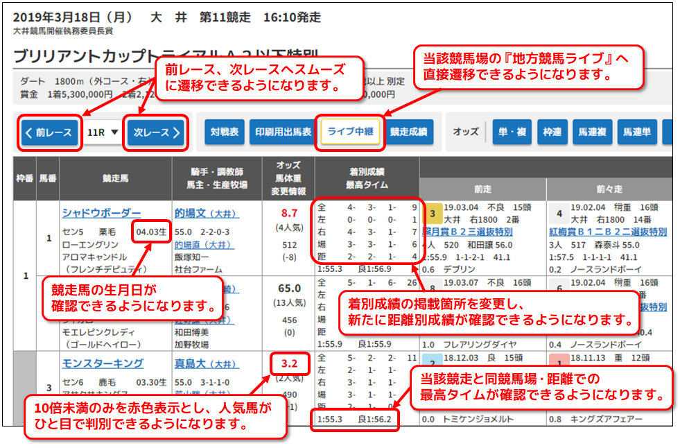 ・前レース、次レースへ直接遷移が可能となります。