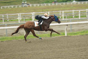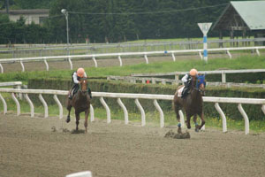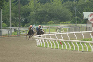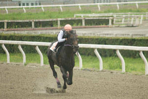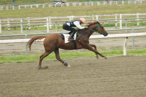 ゲートでは馬の邪魔をせずに出ることができ、4コーナーまでは指示通り、内埒(うちらち)から3馬幅目(およそ3m)を走らせることが出来ました。追い込みでは、実習前より態勢を沈めて追えるようになりました。ですが、直線で手綱の保持が甘く、馬が内側に行ってしまったので、しっかり真っ直ぐに走らせられるようにしていきます。