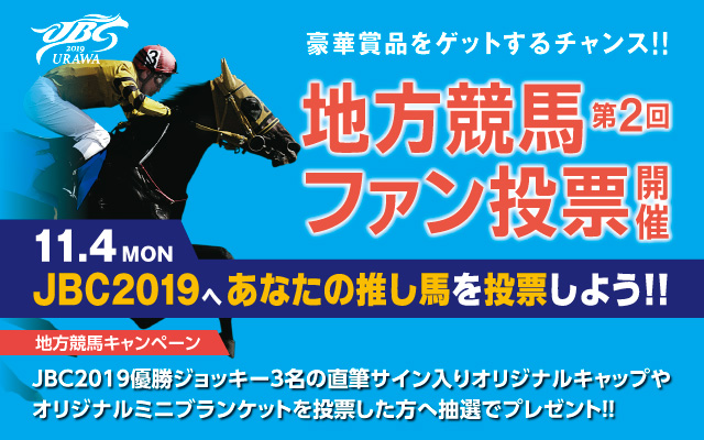 11月4日(振・月)に浦和競馬場で行われるJBC2019に向けて、皆様の推し馬をぜひご投票ください。ご投票いただいた方の中から抽選で、優勝ジョッキー直筆サイン入りグッズを含む豪華賞品をプレゼント。皆様のご応募お待ちしております!
