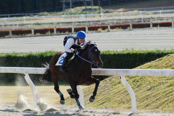 初めての馬なり操作で緊張してしまい、思うように体が動かずただ馬にしがみつくだけの騎乗でした。スタートから走られ気味になってしまい、焦ってやるべき事が出来ずに終わってしまいました。今回の反省点を1つ1つしっかり考えて次の追い込み操作で活かし日々研究していきたいと思います。