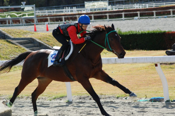 今回の訓練では、内ラチを走行しつつ、向正面から徐々にスピードを上げながらコーナーに入り、コーナーから直線の出口で外側へ出し、馬場の真ん中を走行し、追い込むことはせずに走る気にさせてその馬なりのスピードで真っ直ぐゴールまで走らせることを行いました。