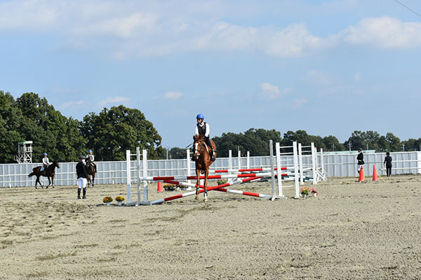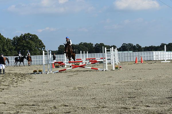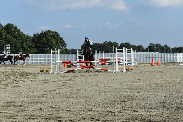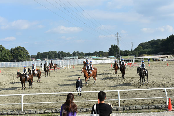 最初に行ったのはカドリールで、馬も人も見慣れていない物がありまた、たくさんの人がいたためイレギュラーが起きてしまったものの全員の息を合わせて最後まで演技をやり遂げることが出来て良かったです。カドリールが終了後、次は2騎での障害飛越を行いました。