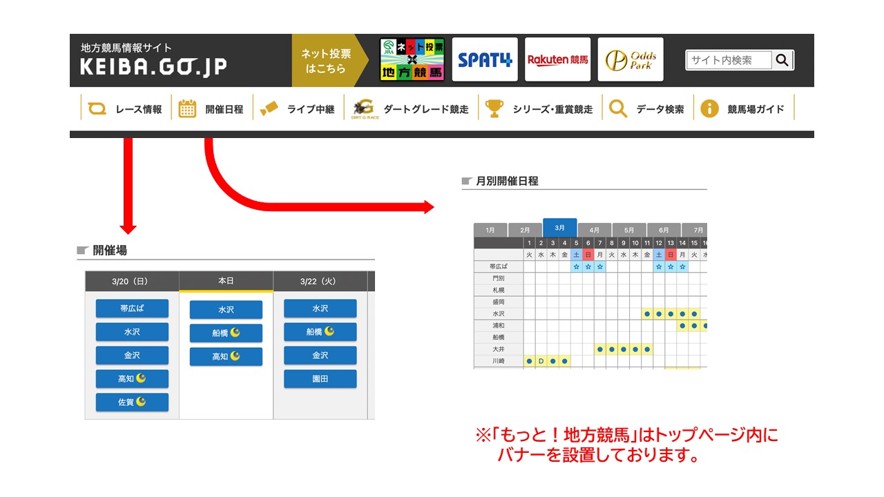 ヘッダーおよびフッターのデザインをリニューアルしました。なお、PC版については、ヘッダーのデザイン変更に伴い、「開催日程」(および「発売日程」)のリンク先が変更となります。また、「もっと!地方競馬」はトップページ内にバナーを設置しております。