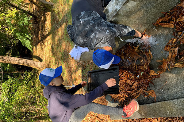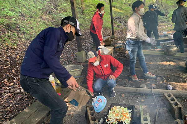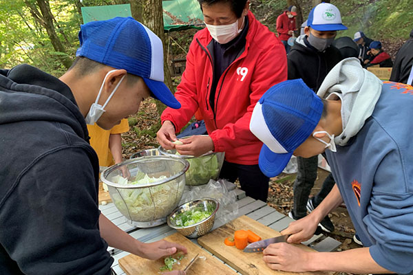 後から来た先生方が到着すると、火をおこす班と食材を切る班で分かれてキャンプの準備スタート!