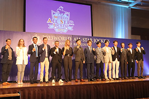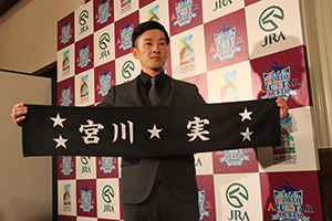 8月26日(土)、27日(日)にJRA札幌競馬場で行われる2023ワールドオールスタージョッキーズ(WASJ)のウェルカムセレモニーが8月25日(金)、札幌市内のホテルで行われました。WASJ出場騎手14名が勢ぞろいし、地方競馬代表騎手として出場する宮川実騎手(高知)も2日間の健闘を誓いました。
