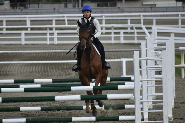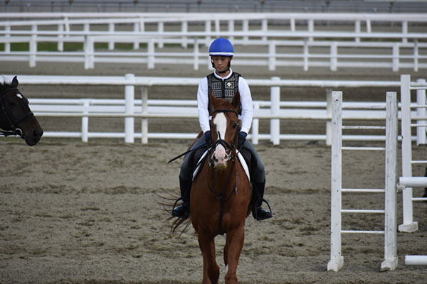 カドリールでは周りとの距離を確認しながら動きを合わせることができました。障害では1つ1つ丁寧に入ることを意識して乗り、2人でタイミングを合わせることができました。これから競走訓練も始まり、より一層基本馬術が大切になってくると思うので、1鞍1鞍を大事に乗り、少しでも技術を高められるように頑張りたいです。
