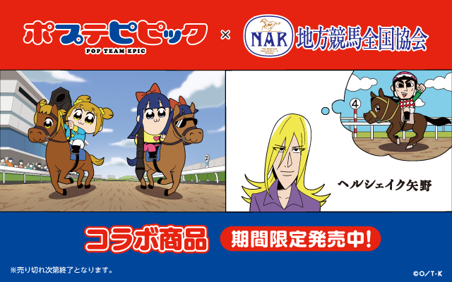 昨年、各競馬場で実施しました「うまガチャ(巨大カプセルトイ)」イベントで、人気アニメ「ポプテピピック」とのコラボグッズを景品の一部にしましたところ、お客様から大変なご好評を頂きましたことから、この度、描き下ろしイラストをデザインに用いたオリジナルグッズを数量・期間限定でインターネット販売することとなりました。