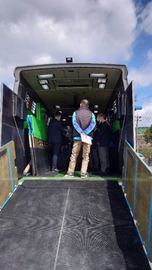 次に日本馬匹㈱の見学に行きました。美浦トレーニングセンターから全国の競馬場に競走馬を輸送する馬運車の見学をさせて頂きました。馬は半日近く狭い馬運車の中で輸送されていくので、快適に過ごせるよう温度管理など沢山の工夫がなされていました。また、運転手さんや厩務員さんが過ごす空間も広い空間が用意されていました。それでも半日近くも輸送するのは大変だと思いました。