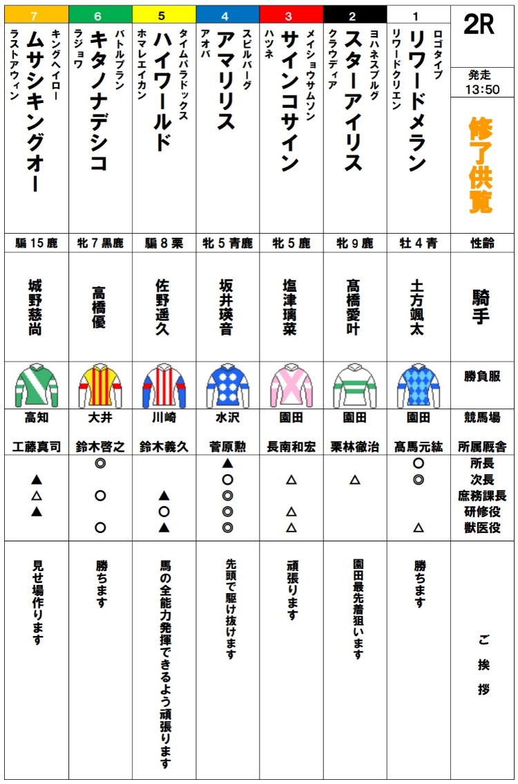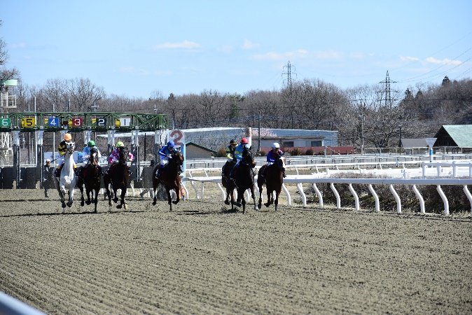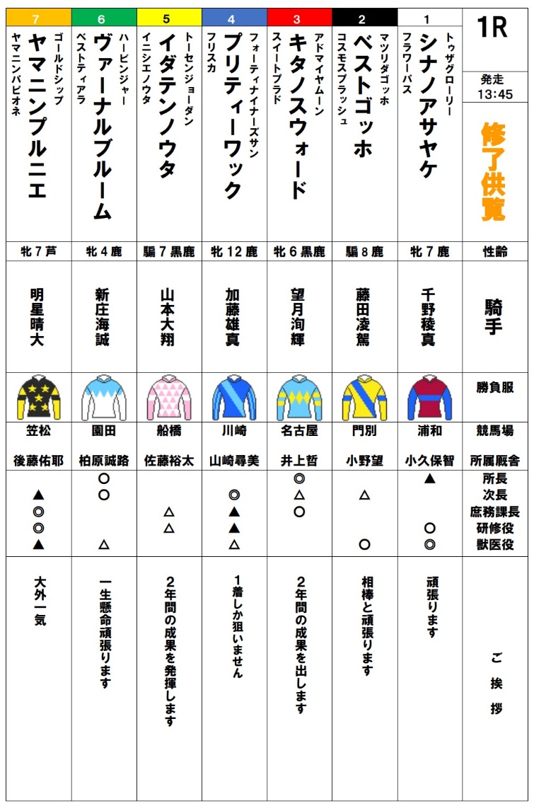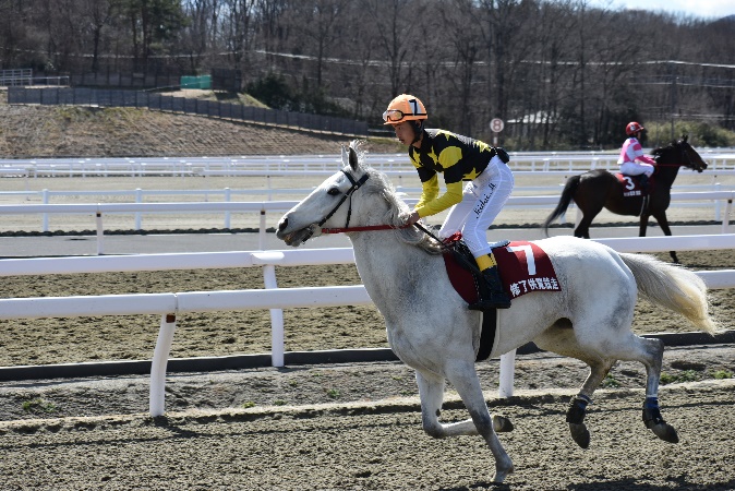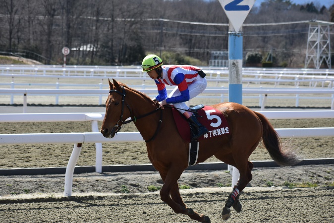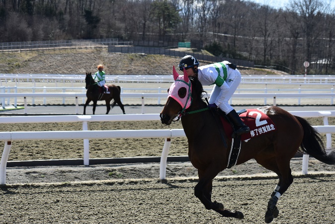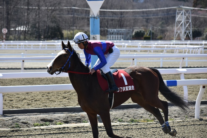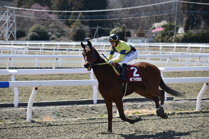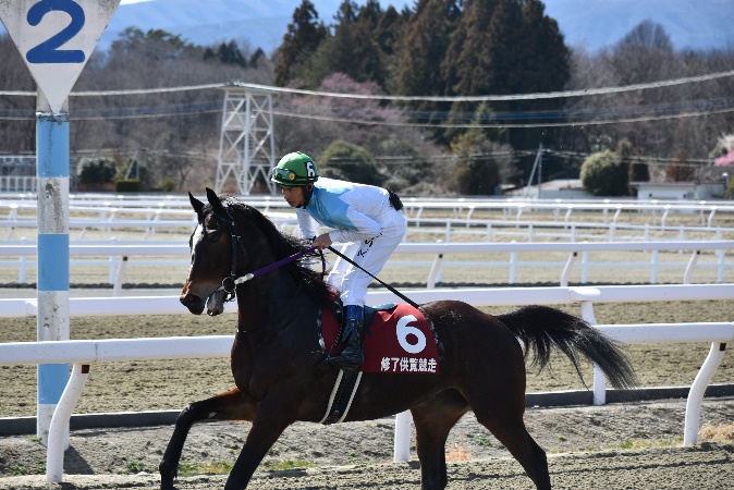 105期生最後の訓練となる修了供覧騎乗では、前日の雨が嘘のような良い天気の中、ご家族、関係者の皆様に見届けられながらの騎乗となりました。各々が勝負服に身を包み、地方競馬の実況アナウンサーの実況の下、7頭立て2競走を実施しました。