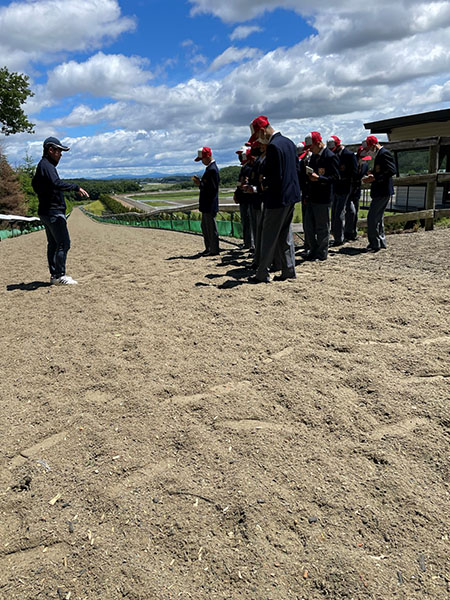 全長900m、高低差36mでタイム自動計測装置があり、馬場の材質はポリトラックでした。ポリトラックとは、ビニール、砂、油を混ぜたもので、特に油を多く含んでいるため、水捌けがよく、天候に左右されないでほぼ同じ馬場状態で調教ができるそうです。
