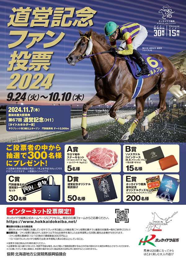 ホッカイドウ競馬は第67回道営記念(11月7日(木))の出走馬ファン投票を9月24日(火)より実施することを発表しました。投票に参加された方の中から、抽選で合計300名様に賞品をプレゼント。詳細につきましては、ホッカイドウ競馬ホームページに掲載の下記お知らせをご覧ください。