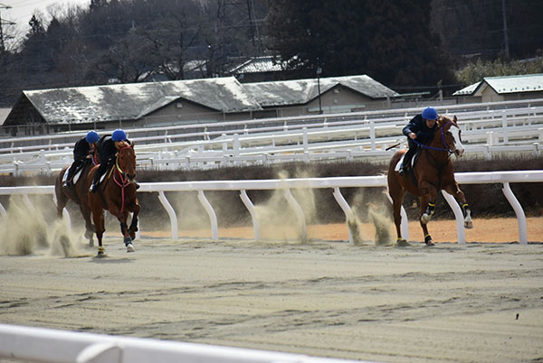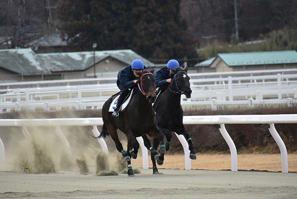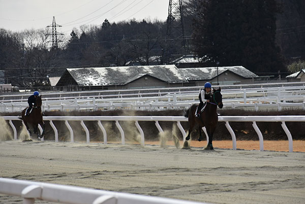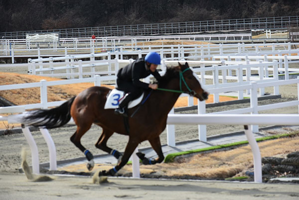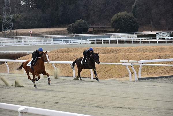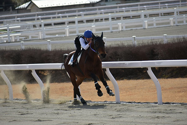 初めての併走で発走から追い込みを行い、発走してから横の馬を見ながら合わせていく事ができましたが、向こう正面で外に行ってしまいコーナーでも外を回してしまう形になってしまいました。追い出しも直線を向いて進路を定めてから追え、前回より落ち着いて鞭を打てました。まだ追い込み姿勢で腰が高くなってしまうところがありますので、今後も訓練や映像を見ながら修復できるようにしていきます。