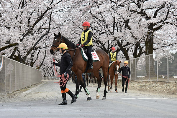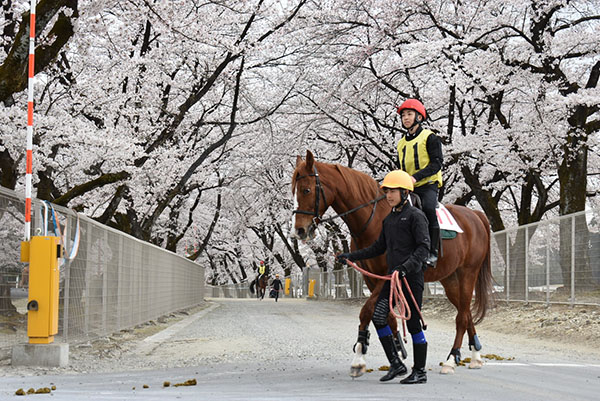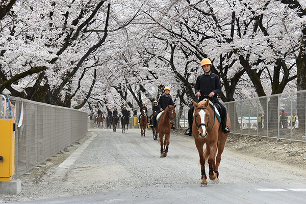 以前は、20頭以上が列になって大々的に外乗していましたが、現在は放馬事故防止の観点から、センターの桜並木を見上げる那須塩原市道の一部エリアのみの行進に縮小して実施しています。