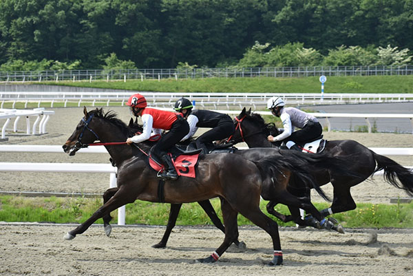 今回の競走実習では、内ラチとの距離を常に意識して最後の直線で前かがみにならないようにすることを目標にして臨みました。ゲートを出てから第一コーナーに入るまでに位置取りを周りを見ながら判断出来ましたが、急に内に入ってしまった事で馬のリズムを崩してしまったので馬のリズムを崩すことなく走り切る事が今後の目標となりました。最後の直線では鐙を真下に踏んで追うことは出来ましたが、より低い姿勢を取れるように日常的なトレーニングを欠かさず大切にしていきたいと思います。