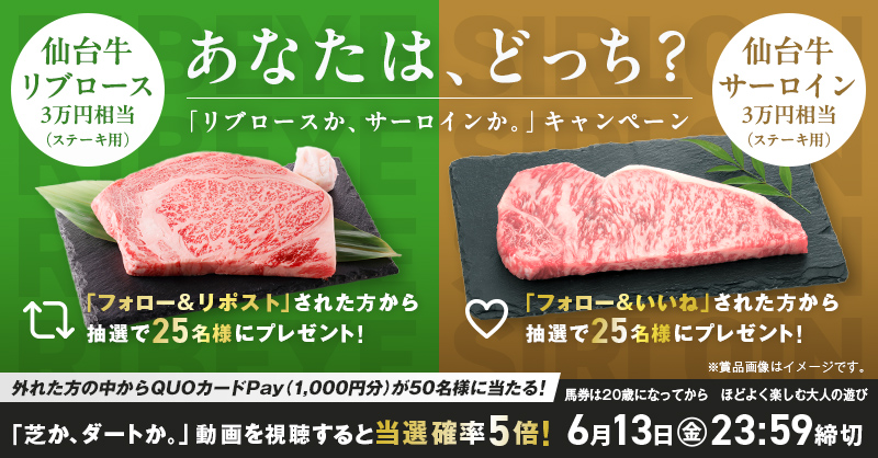 「芝か、ダートか」2つの路線で繰り広げられる日本競馬の熱戦を盛り上げるべく、NAR地方競馬全国協会では6/4(水)10時00分より、3万円相当の国産銘柄牛肉が合計50名様に当たるXキャンペーンを実施します。
