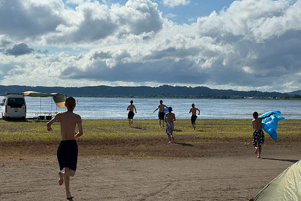テントを張り終わった後、猪苗代湖にダーーイブ!!