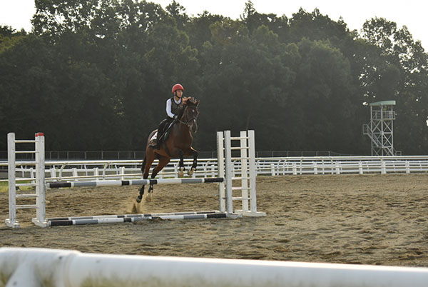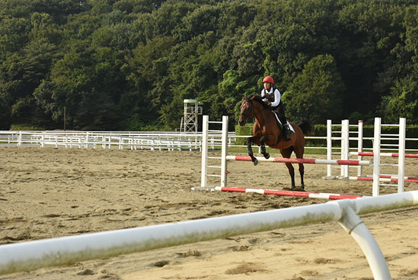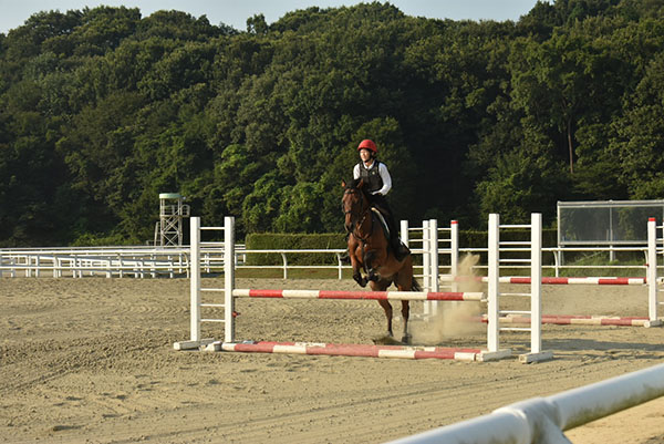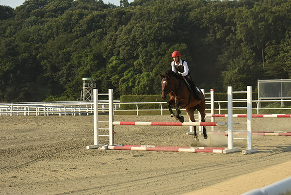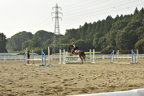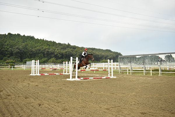 今回は障害の経路を初めて回りました。先跳びをしてしまったときがあったり、障害に真っすぐ向かえなかったりして、常に馬に助けられた技能審査でした。今後の訓練では馬を手の内に入れる事や、今後さらに障害の高さが上がるので先跳びをしないようにしっかりと待つことを意識して今後の訓練に励んでいきたいです。
