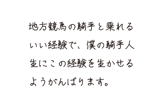 デビューした昨年に続き、2年連続でファイナル出場を決めた。トライアルラウンド浦和第1戦では逃げ馬3頭横並びの一番外でレースを運ぶ形になったが、向正面で上手くなだめて内に入れ、直線ではリードを保って勝利した。他のトライアルラウンドでも3着2回、5着1回と安定した成績を残した。昨年、総合優勝を果たした岩本怜騎手(岩手)とは同じ千葉県出身で、騎手になる前からの仲。ライバルに負けじと、昨年総合11位の雪辱を果たせるか。
